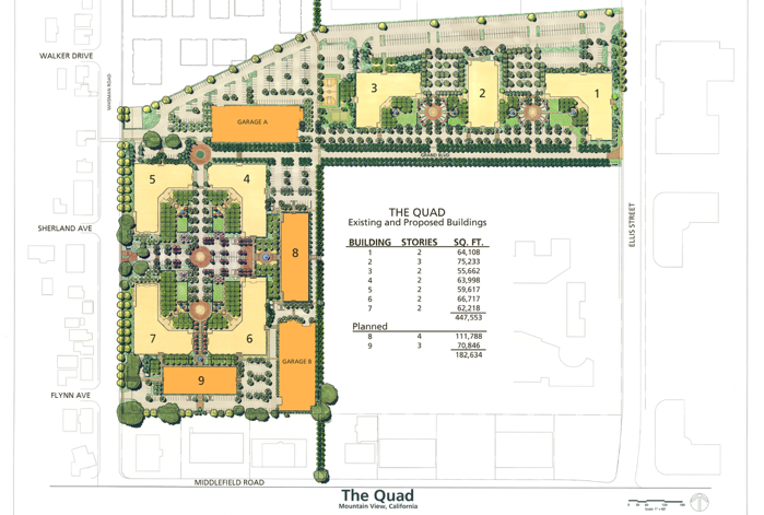 The Lovewell Company has two additional buildings planned for the Quad, totaling approximately 182,000 square feet. If constructed, the additional buildings will bring the total potential campus to nine buildings of about 630,000sf. The plan, which was approved by the City of Mountain View in late 2011, provides Google with a unique, flexible expansion option. The buildings will be constructed on an "as needed" timetable, based on a 10-year development agreement with the City of Mountain View. (Google has not yet indicated whether the company would like to proceed with construction of the additional buildings).